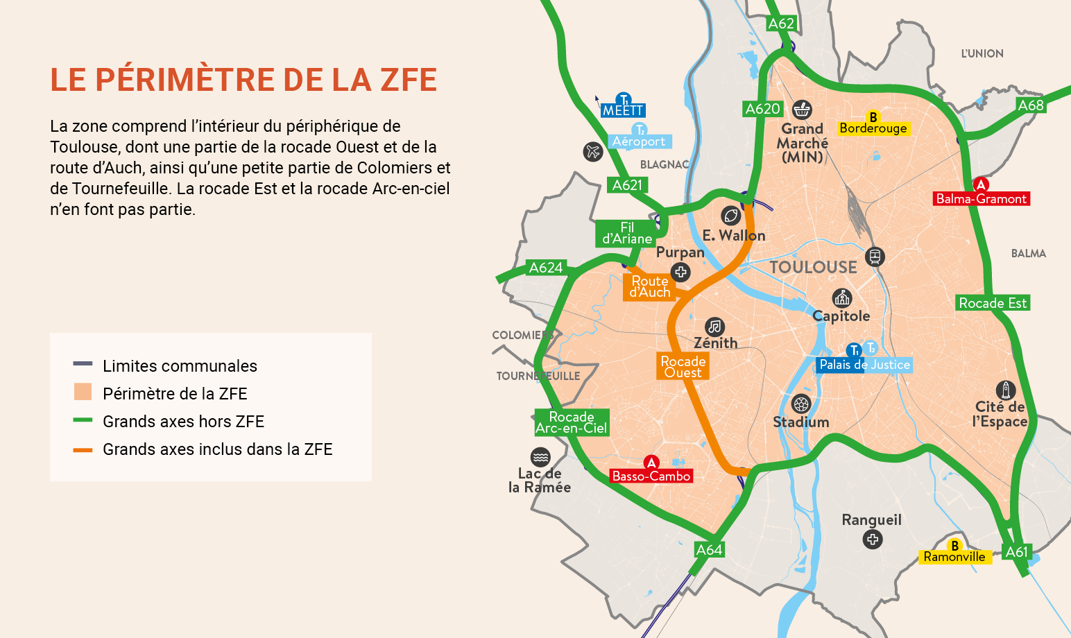 Ekologickú zónu Toulouse ohraničuje cestný okruh Périphérique a spadá do nej väčšina územia mesta. Mimo zóny sa nachádzajú diaľničné ťahy A62, A61 a A620.